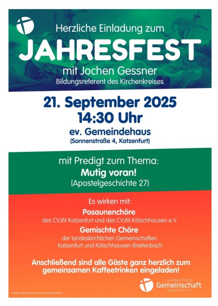 Am 21. September 2025 findet um 14:30 das Jahresfest des CVJM Katzenfurt und der landeskirchlichen Gemeinschaft Katzenfurt e.V. statt.
